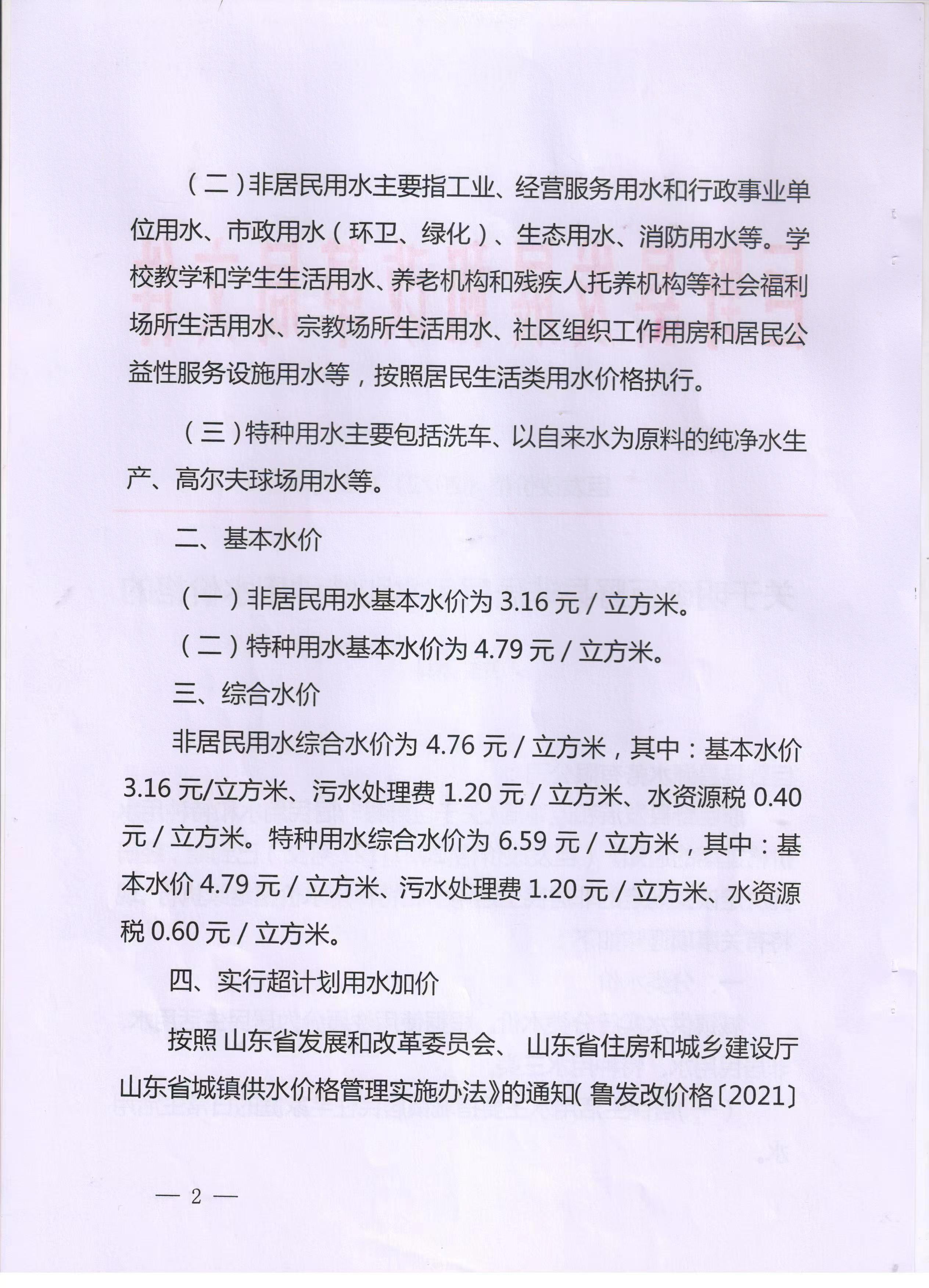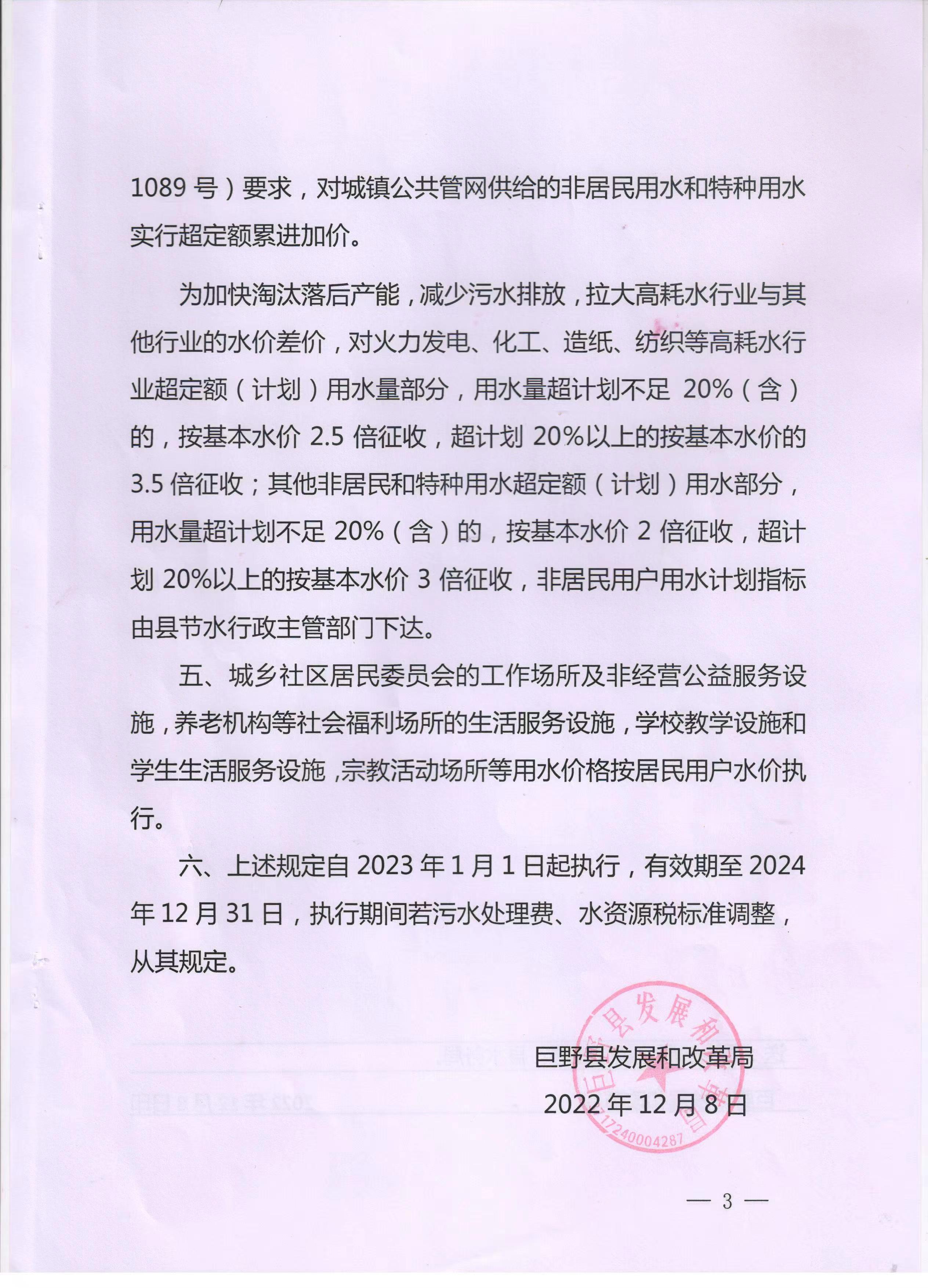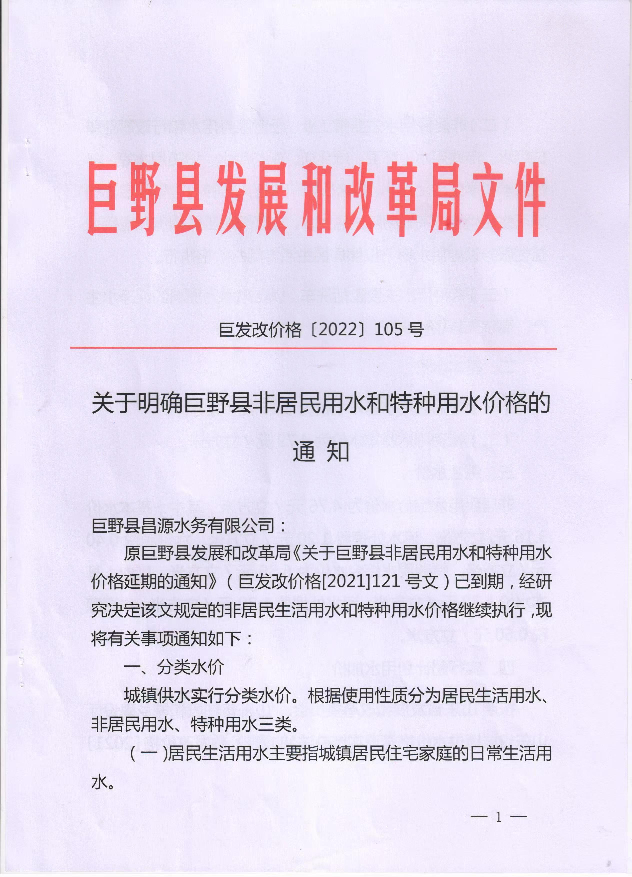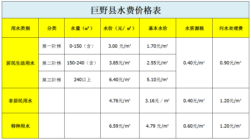关于公布巨野县非居民用水和特种用水价格的通知